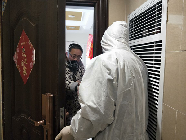 身著防護服開展入戶測溫工作